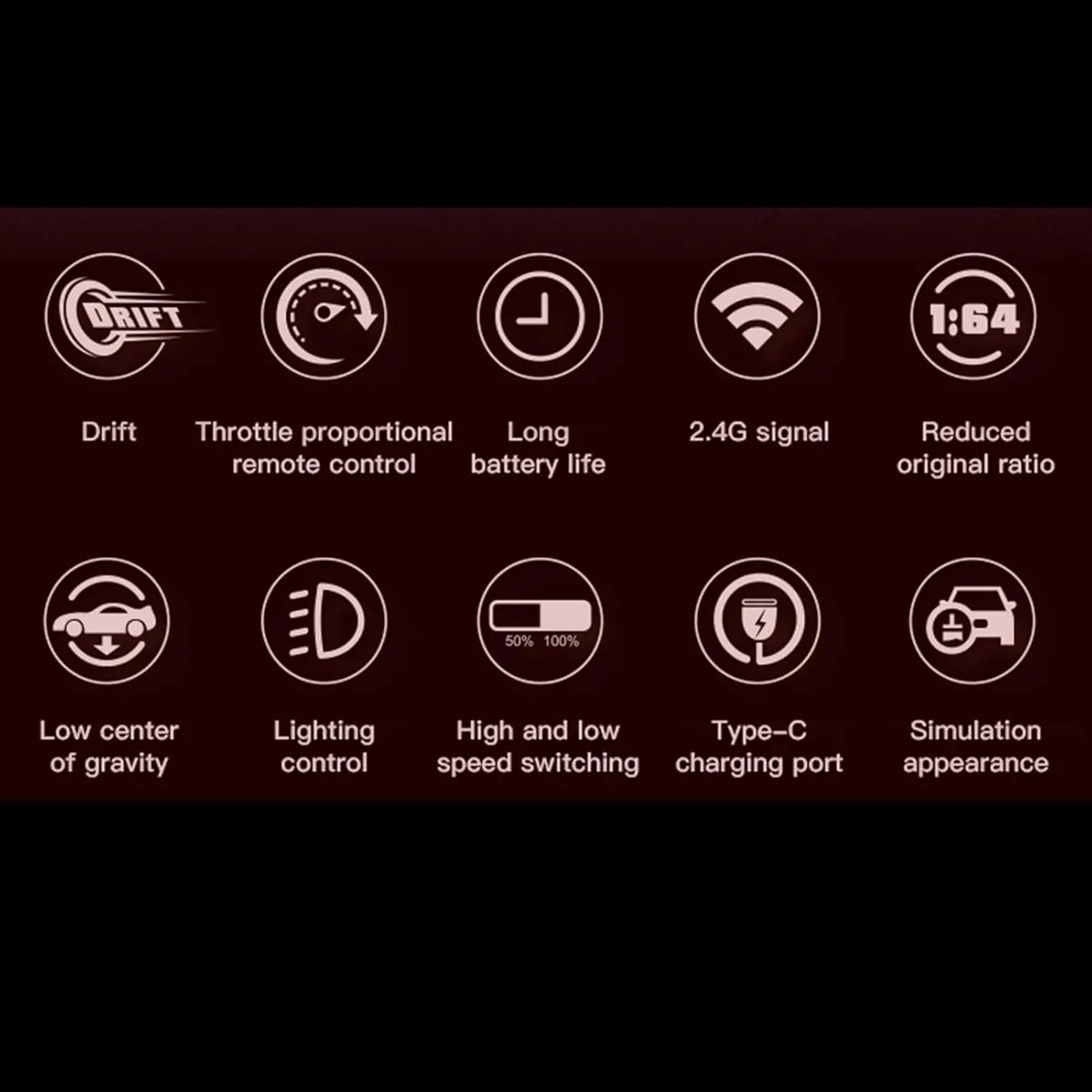 - Incluye: 1 coche RC, 1 control remoto, 1 cable USB, 1 destornillador, 1 manual, 4 conos de tráfico
