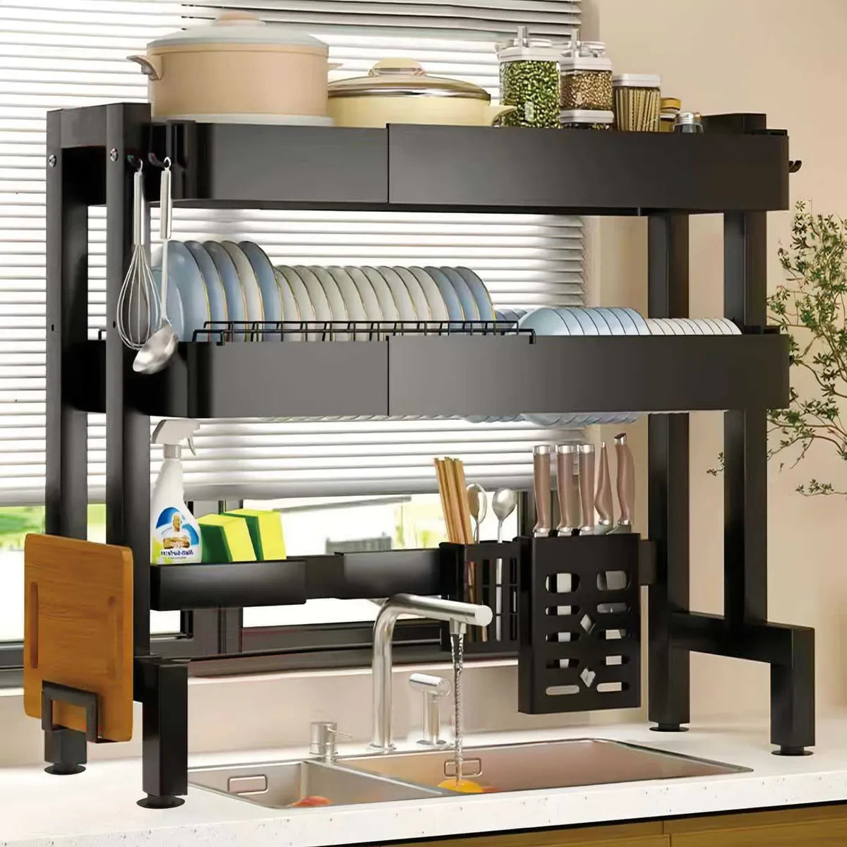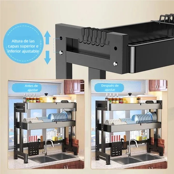 ¿Cansado de que tus platos se amontonen y se sequen lento en el fregadero? Este escurridor ajustable sobre fregadero te ofrece un espacio ordenado y ventilado para hasta 35 platos, con dos niveles que aprovechan cada centímetro sin ocupar mucho lugar.